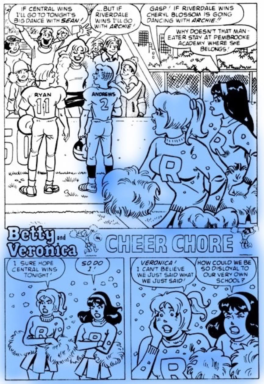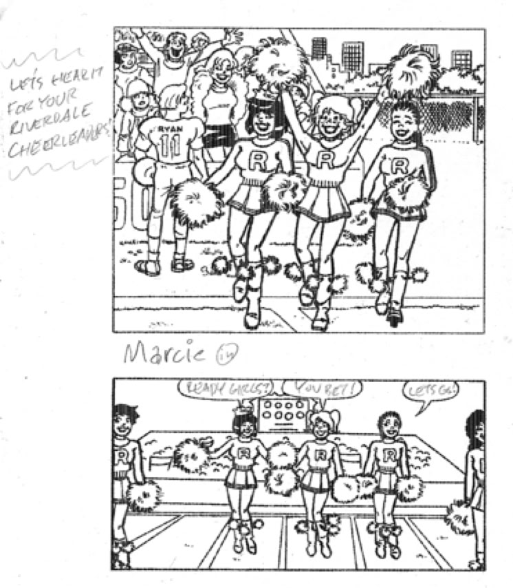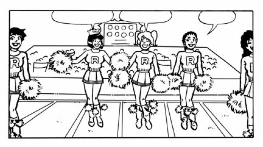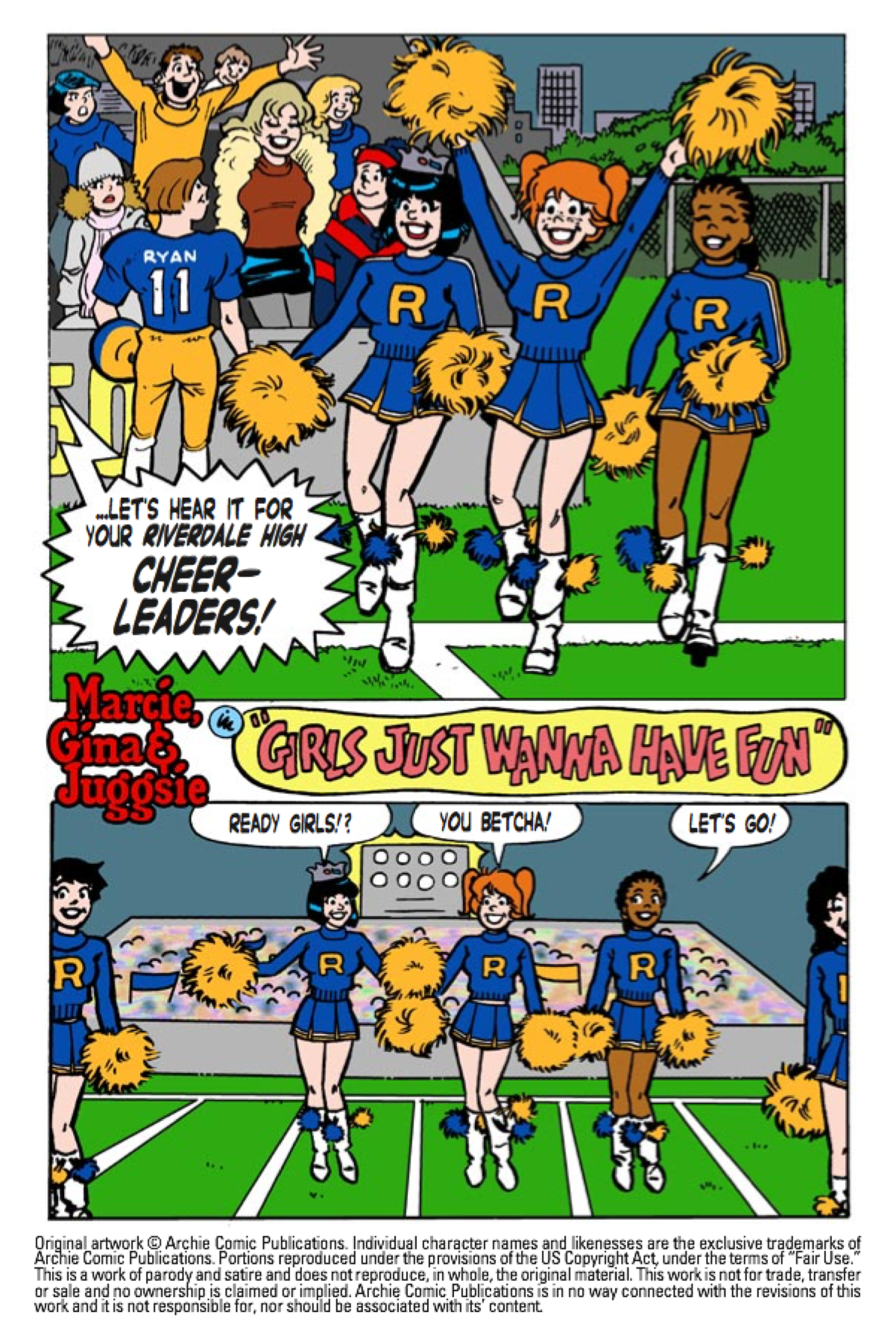 The page now does exactly what I want. It has our three girls being introduced as cheerleaders, and establishes them back in Riverdale at a football game.