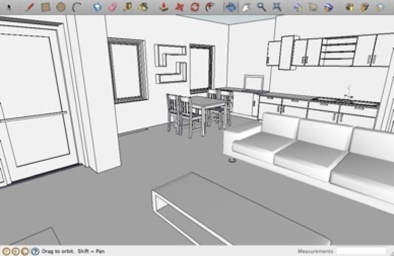 To take care of that, I downloaded and installed Google Sketch-Up which renders 3-D models. I found a house model layout I liked, messed around with it, and now had the basic set I’d use a lot in the course of the comic. The characters spend about 80% of the comic in one room. I really needed this, as I didn’t want to re-sketch the same thing 100 times by hand. I made several screen shots and used them as guides, tracing them in Manga Studio.