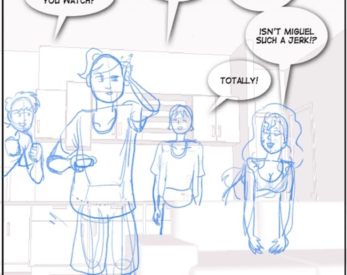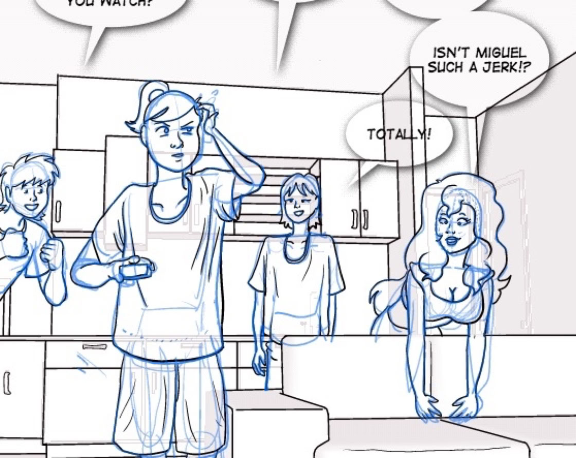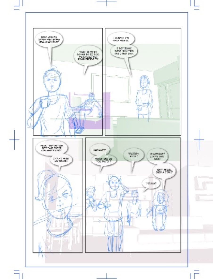 With all the guides in place, now it’s time to draw the meat. Also known as humans. The people need to get drawn into the panels. That was the next step.