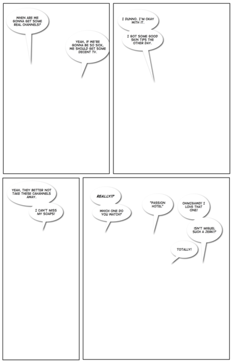 Now I had plot and pacing. Next was the script. In the interest of time, I went right to doing the text bubbles for this step. Rather than try and visualize how text would fit into a page, putting it onto the page at this step made it a lot easier to make sure I could fit dialogue into the limited space and still move the plot along. I went over it several times until I was satisfied I could move on to the art stage.