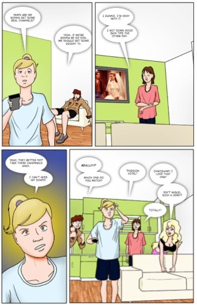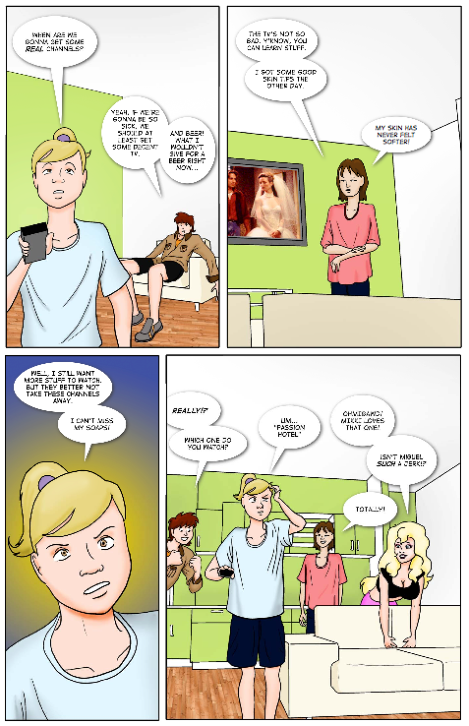 Panel 1 had two people, one is controlling the TV, the other is relaxing in a chair. Panel 2 has the TV visible, so we can see what they’re talking about in Panel 1, and the character is drawn small to look humble and slightly shy, matching what he’s saying.