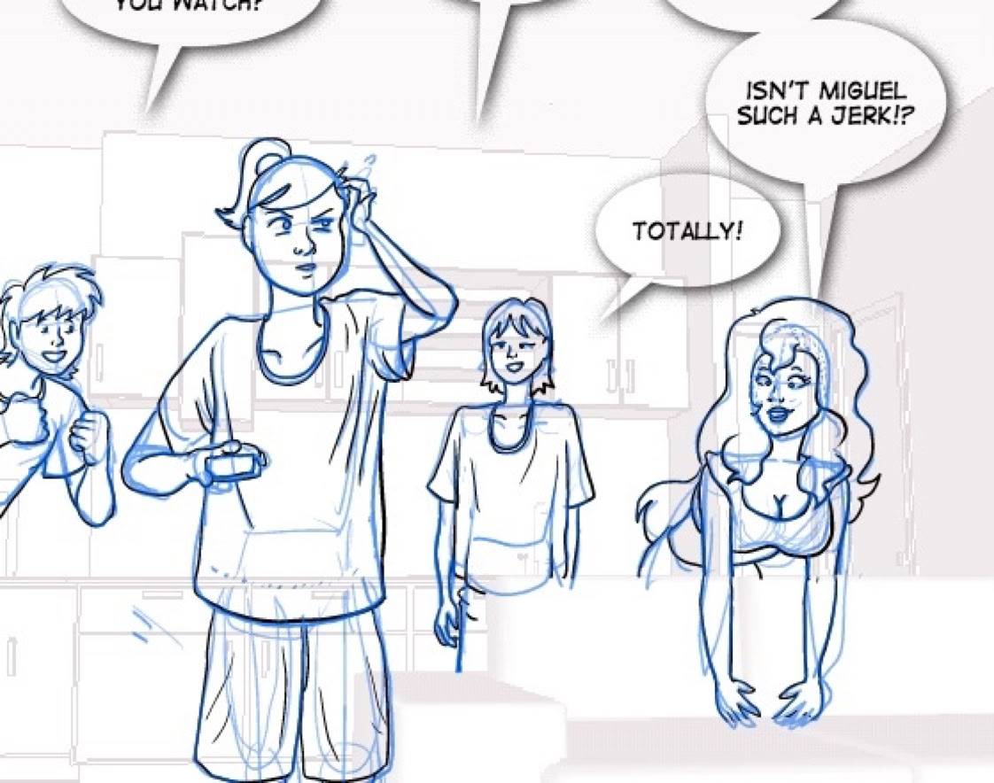 A challenge of making a comic is that you have no “inner dialogue” or descriptive text. You can’t write how someone feels or describe concepts. You have to show it. It’s impossible to say “Jim felt a certain subtle guilt at eating his wife’s wonderfully tart pancakes that left him conflicted about the affair he had been hiding from her for five years.” Forget it. You can’t get away with that in a comic. It would take several panels to draw that one sentence. Comics is all visual. So the script needs to be crisp and concise.