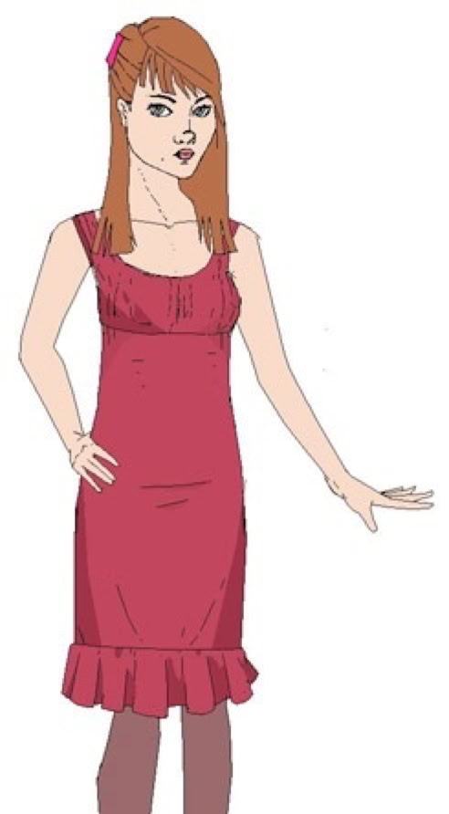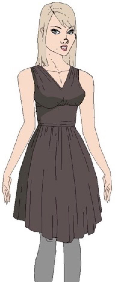 "It's getting late, Charlize, you have to get ready for the ball! Let's try on my old cocktail dress next", Stacey interrupted as she again flew to her room and came out with a beautiful, black, scrunchy dress. She helped Charlie out of the blue dress and held open the cocktail dress as Charlie stepped into it. As a finishing touch, she undid the clip in the wig and let Charlie's "bangs" come loose.