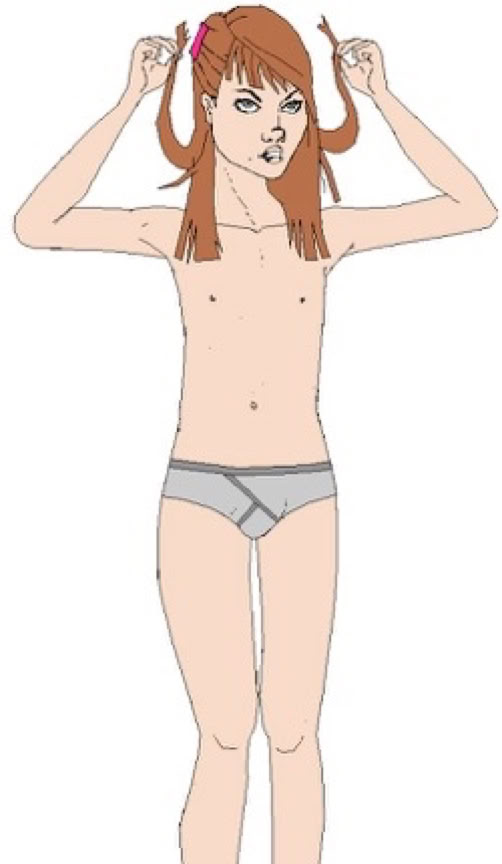"Cute, very cute," said Stacey as she approached Charlie, "but you are missing one little detail." She motioned Charlie to sit down on the edge of the bathtub and she set out to work on what little hair Charlie had on his head. With in minutes, she combed out his short bangs and added two pigtails. She couldn't hold in her laughter at the sight and let out a few giggles. Charlie wondered what was going on and took a look into the mirror.