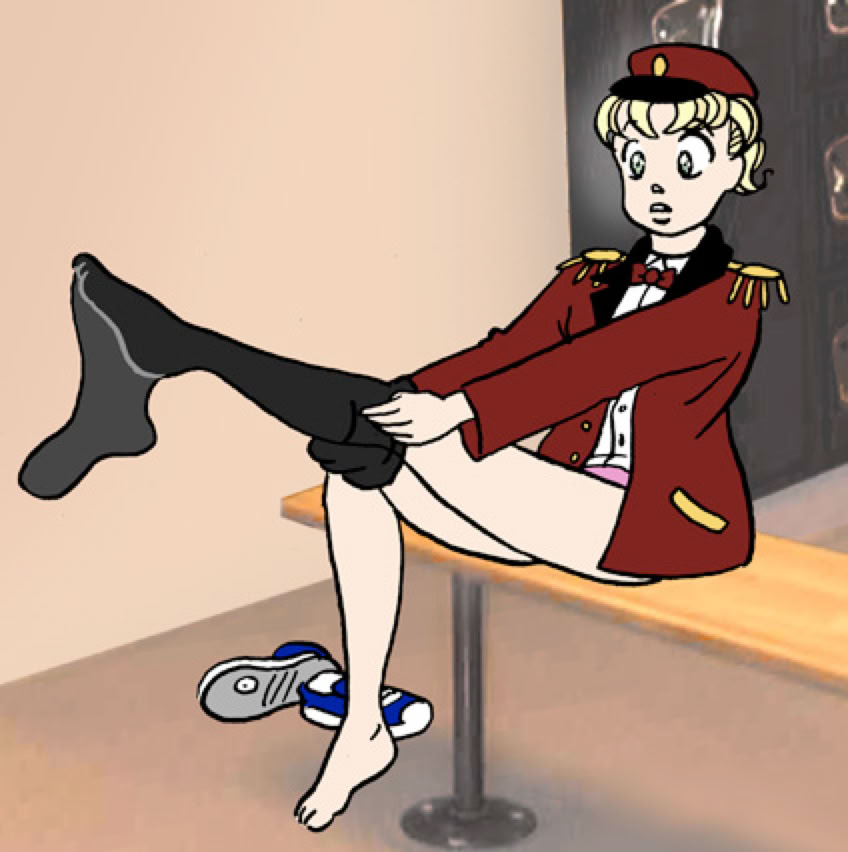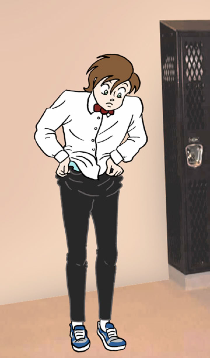 But on this particular day, after prying the locker door open, he found something a little strange inside. The jacket and his dumb little hat were just as he had left them. But the pants - they were different. He really didn't think much was up until he had them all the way on. They were oddly tight around his waist and hips, but loose and flowing on the legs. They also seemed to be made out of a much lighter material than whatever his regular pants were made of. And Mike took a few minutes to figure out that they were supposed to zip up the side rather than trying to twist the belt around to the front where the fly was supposed to be.