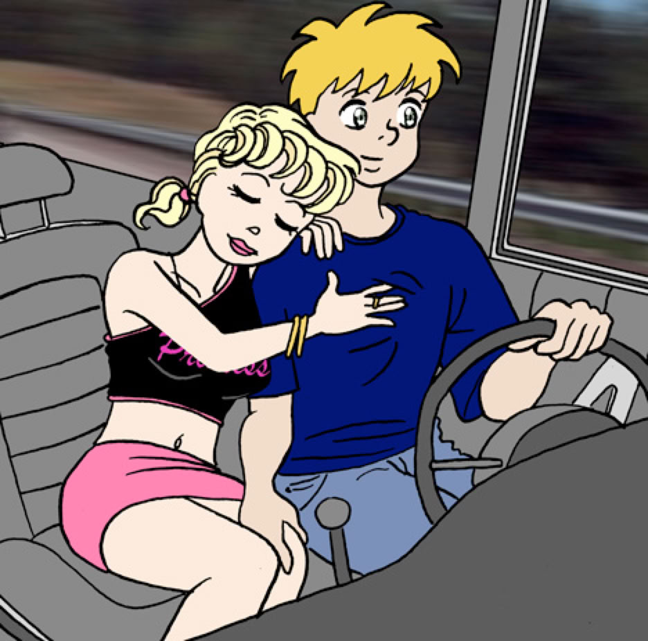 So she got into Brandon's car and they both waved their goodbye's to Dan as they drove off. It wasn't very long before Brandon's hand was on Angie's bare leg, where her miniskirt ended. And Angie leaned over to rest her head on Brandon's shoulder, rubbing his chest as he drove.