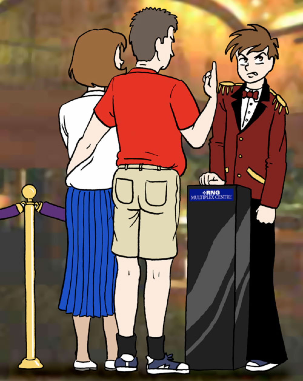 He tore them in half and handed back the stubs, as he did a few thousand times a day. Mike just tried to keep his focus on his job, even when he could clearly see out the corner of his eye that his Mom and Dad had approached his manager and were pointing back at him. Sheesh. Did adults have no shame? Who knows what they were asking his manager. "Does he comb his hair?" "He doesn't slouch, does he?" And such.